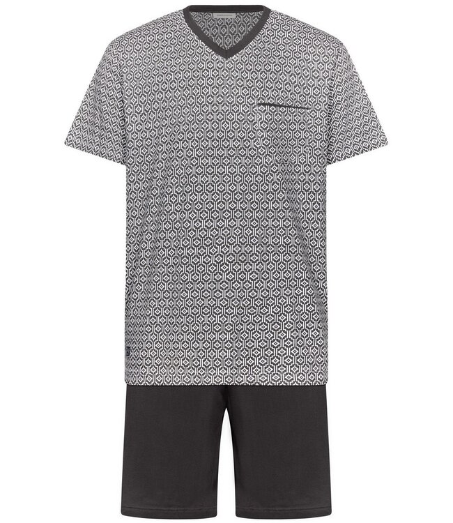 cool comfort dark grey & white mens cotton shorty set with dark blue patterned t-shirt style v neck top with handy chest pocket and smart grey shorts with an elasticated waist Read more.