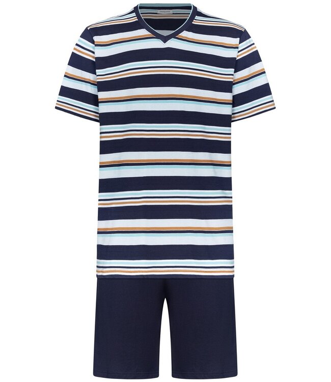 groovy stripes marine blue, turquoise, brown & light blue men's 100% cotton 'v' neck stripey shorty set with marine blue cotton shorts with a comfortable elasticated waist Read more.