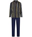 'modern stripes' marine blue, jade green, orange & pale blue men's long sleeve cotton-modal full button pyjama set with revere collar, marine blue piping, chest pocket and long marine blue pants with an elasticated waist and 2 side pockets