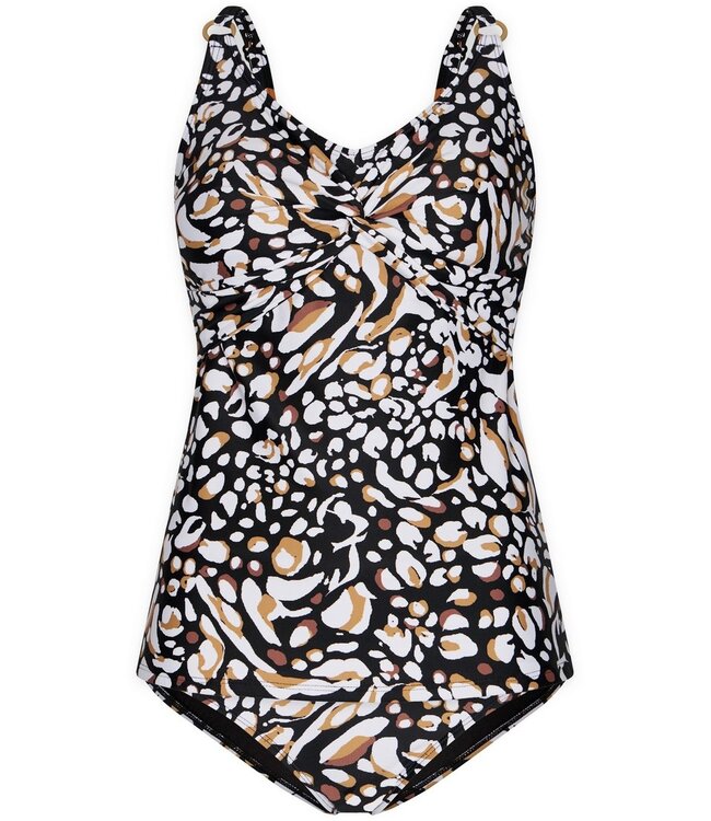 sandy beach brown, black & white soft cup v-neck tankini set with adjustable straps a powernet on the inside for a little extra support with a nice beautiful twisted knot finish under the breast and matching bottoms with a high fit Read more.