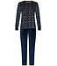 'abstract forest flowers' petrol blue, pure white, brown & mustard yellow,soft, warm velvet fleece home-lounge pyjama with an abstract flowers pattern, yellow lines along the ribbed neckline and cuffs and long petrol blue pants with an elasticated waist