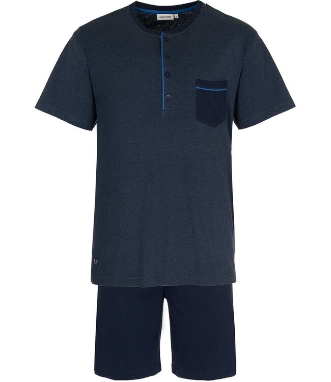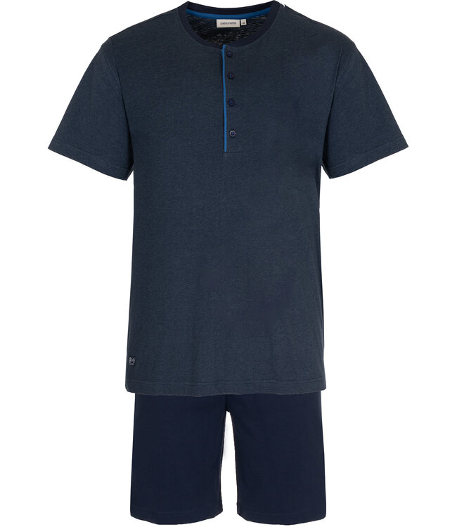 'comfort men' donkerblauwe herenshortama van 100% single jersey katoen met korte mouwen, knoopjes aan de ronde hals en bijpassende korte, comfortabele donkerblauwe broek met elastische taille - Go for comfort & look great!