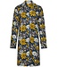 ‘Forest Flowers’ donkerblauw dames nachthemd van katoen-modal met lange mouwen, volledige knoopsluiting en reverskraag in een all-over wit, geel & bruine bloemenprint met donkerblauwe bies langs de kraag en knooplijst