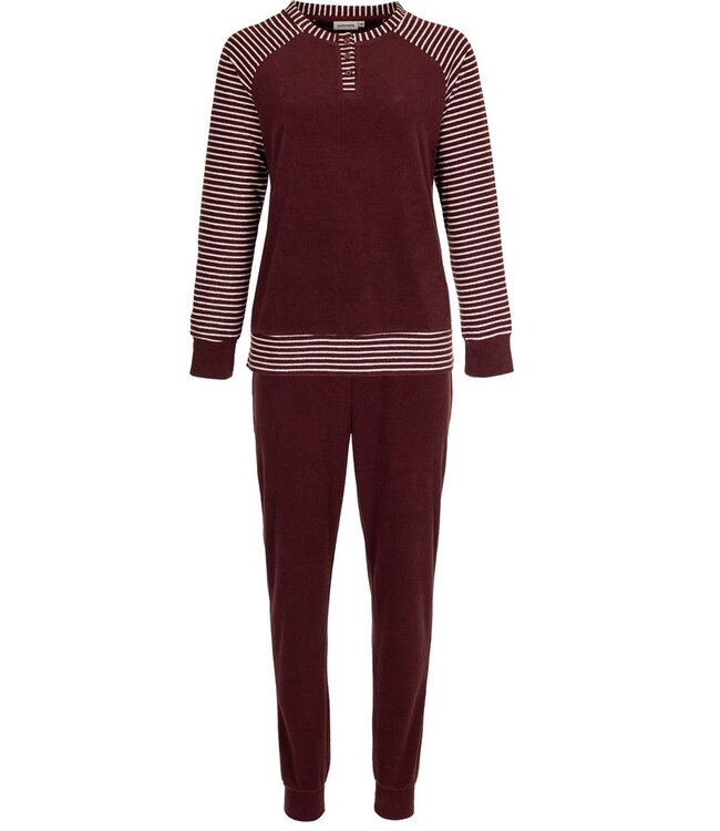 'comfort stripes' donkerrode en witte damespyjama met lange mouwen van badstof met drie knoopjes aan de hals, gestreepte mouwen met boord en een lange donkerrode broek met boord en comfortabele elastische tailleband.