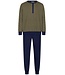 ‘Geometric Blocks’ saliegroen, marineblauw & witte heren pyjamaset van 100% biologisch katoen met lange mouwen, 4 knoopjes aan de hals en comfortabele ribdmanchetten en lange marineblauwe broek met boorden en elastische taille