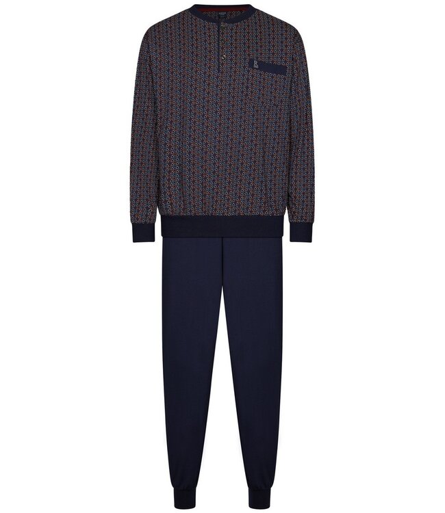 triangle trivia heren pyjama van 100% katoen met lange mouwen, ronde hals, 3 knoopjes en borstzakje in een modern driehoekdessin en lange donkerblauwe broek met boorden en elastische taille Lees meer.