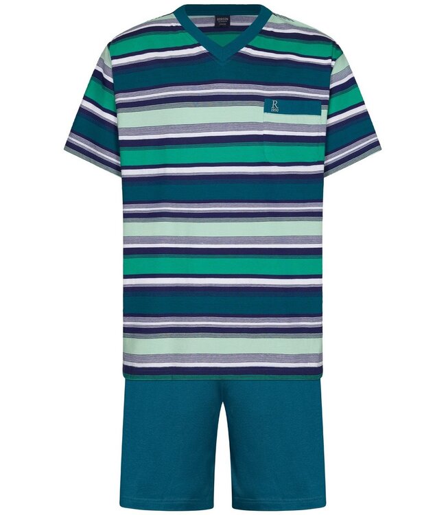 stripey green heren shortama van 100% katoen met v-hals, borstzakje en groen-blauw streepdessin, met effen groene short en comfortabele elastische taille Lees meer.