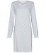‘Little Dotty Circles’ blauwlila & wit dames nachthemd met lange mouwen van 100% biologisch katoen, wijde ronde hals met 2 knoopjes en een mooie gerafelde mouwrand in een all-over stippenpatroon