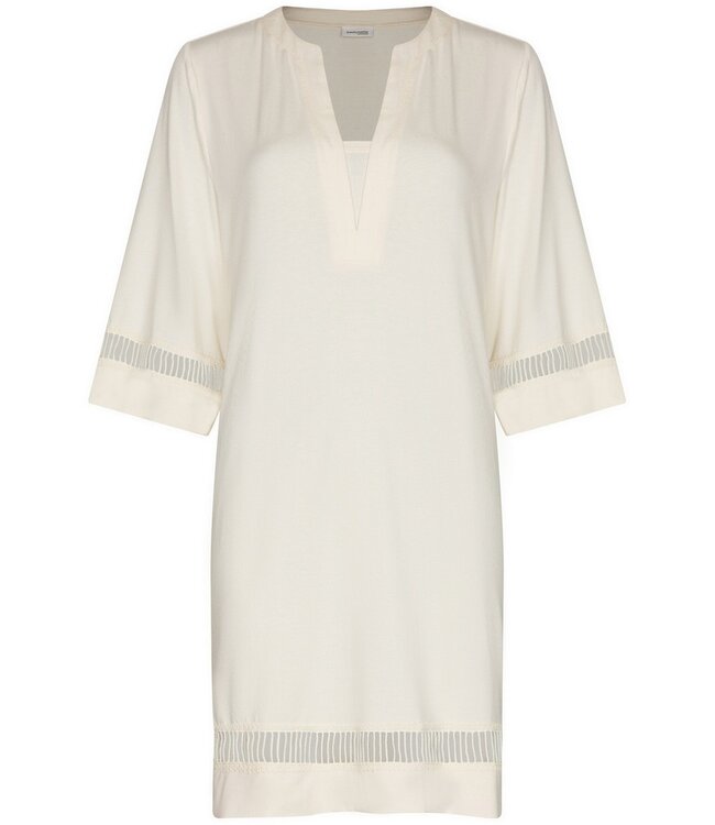 Viscose met elastaan is een fijne kwaliteit voor een strandjurkje omdat het soepel valt en het comfortabele draaggevoel. De stof is ademend, voelt zijdezacht aan op de huid en biedt dankzij elastaan lichte stretch en bewegingsvrijheid, perfect voor warme zomerdagen.